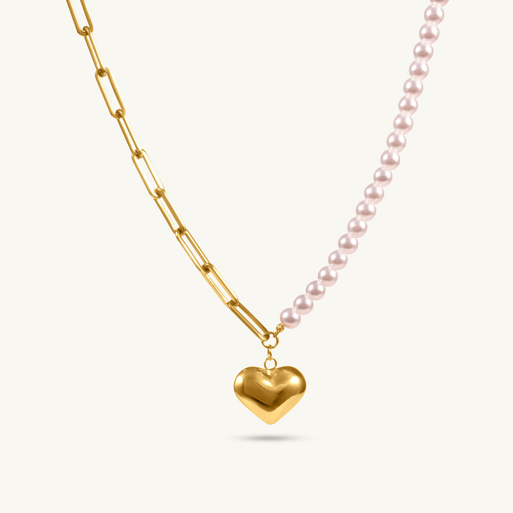 The Eternal Love Pearl Pendant Necklace is a modern ode to romance and elegance. Designed with lustrous pearls on one side and a sleek golden link chain on the other, it is beautifully balanced by a glossy golden heart pendant at its center. This unique blend of classic pearls and contemporary gold detailing creates a versatile accessory that is both chic and timeless. Perfect for women who love meaningful jewellery, it transitions seamlessly from everyday wear to special evenings. A statement of love and sophistication, this necklace is a must-have in every jewellery collection.