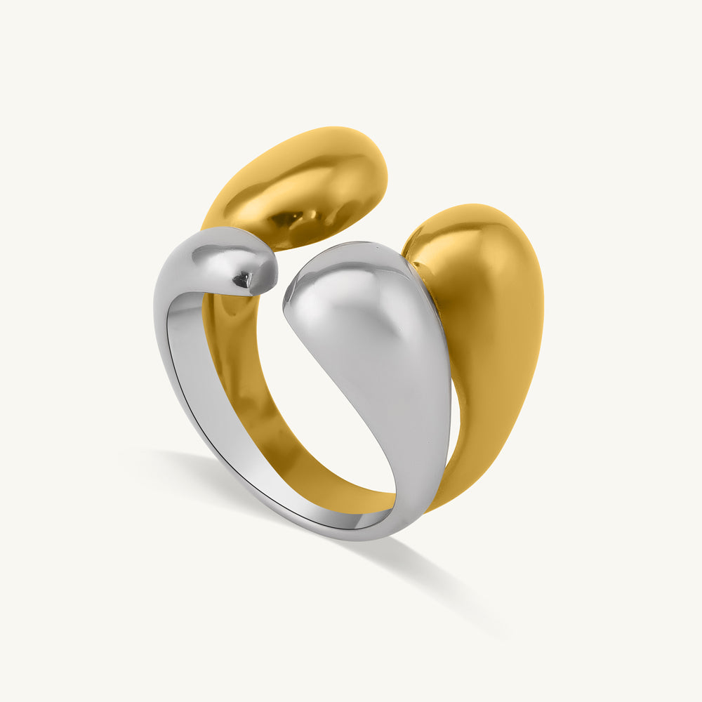 The Fusion Drop Dual Tone Ring blends silver and gold into a striking drop-inspired silhouette. Designed with precision, this contemporary ring symbolizes unity and fluidity. Its sculptural appeal makes it a versatile accessory, offering bold contrast through its dual metallic tones. With its unique fusion of finishes, this ring stands as a modern statement of elegance and creativity. An essential piece for jewellery lovers, it represents timeless design with a fresh perspective.