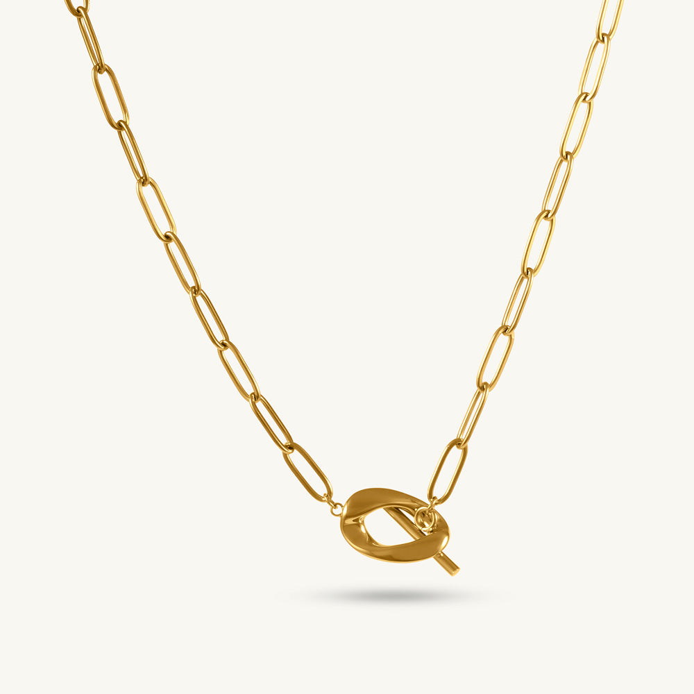 The Lock & Bar Charm Necklace is a bold golden piece that merges strength with style. Featuring a striking lock charm suspended from a sleek bar, it symbolizes security, individuality, and confidence. A modern statement necklace that pairs easily with everyday fashion or elevated evening wear, it’s an essential accessory for women who love jewellery with meaning and presence.